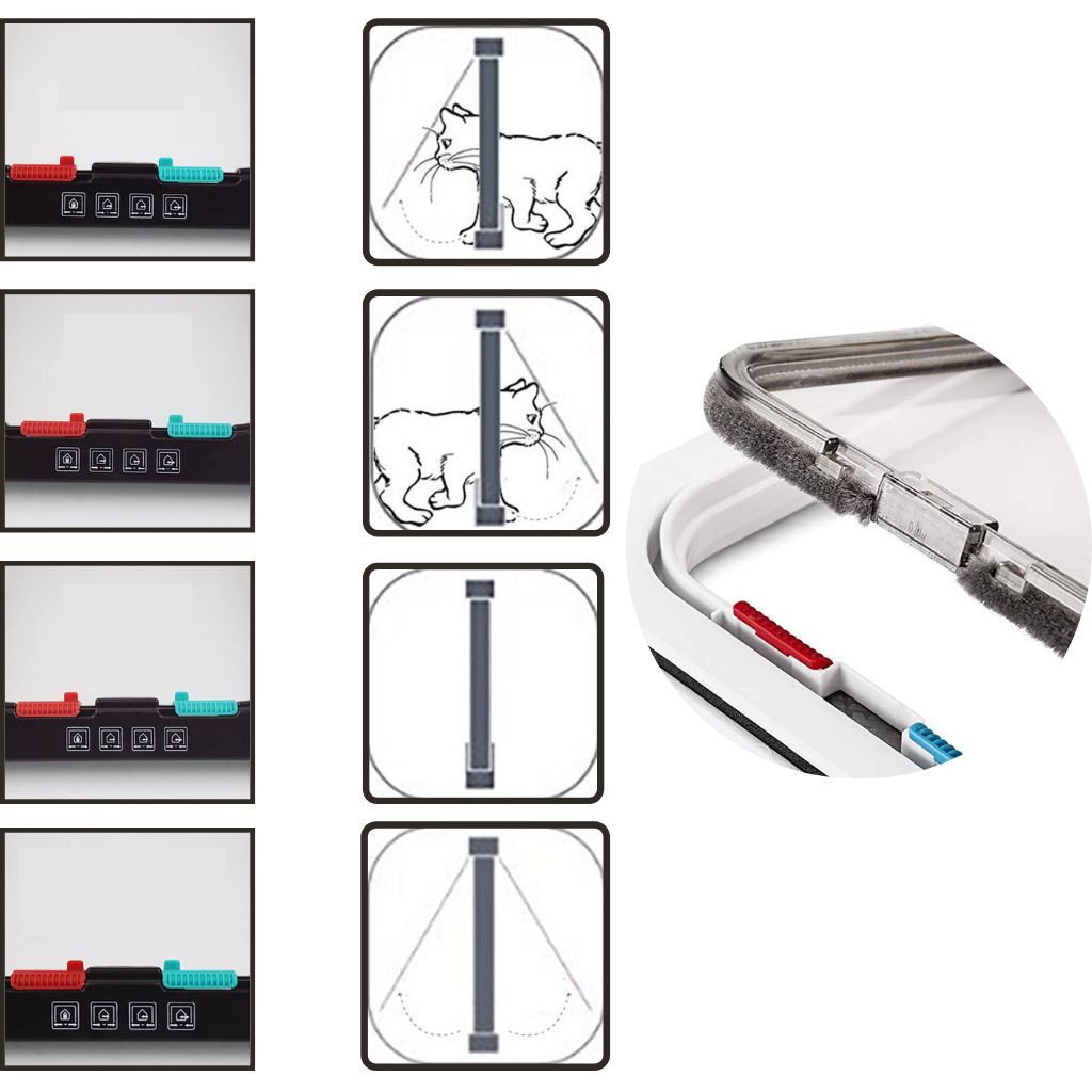 Per la vostra sicurezza, questa gattaiola ha un sistema di bloccaggio a 4 vie per darvi la massima tranquillità. È disponibile in 4 modalità di apertura e chiusura: completamente bloccata, accesso libero, solo accesso dall'esterno e solo accesso dall'interno. Le sue linguette rosse e verdi agiscono come interruttori e sono dotate di diagrammi guida in modo da poter determinare il modo in cui si desidera bloccare o aprire.